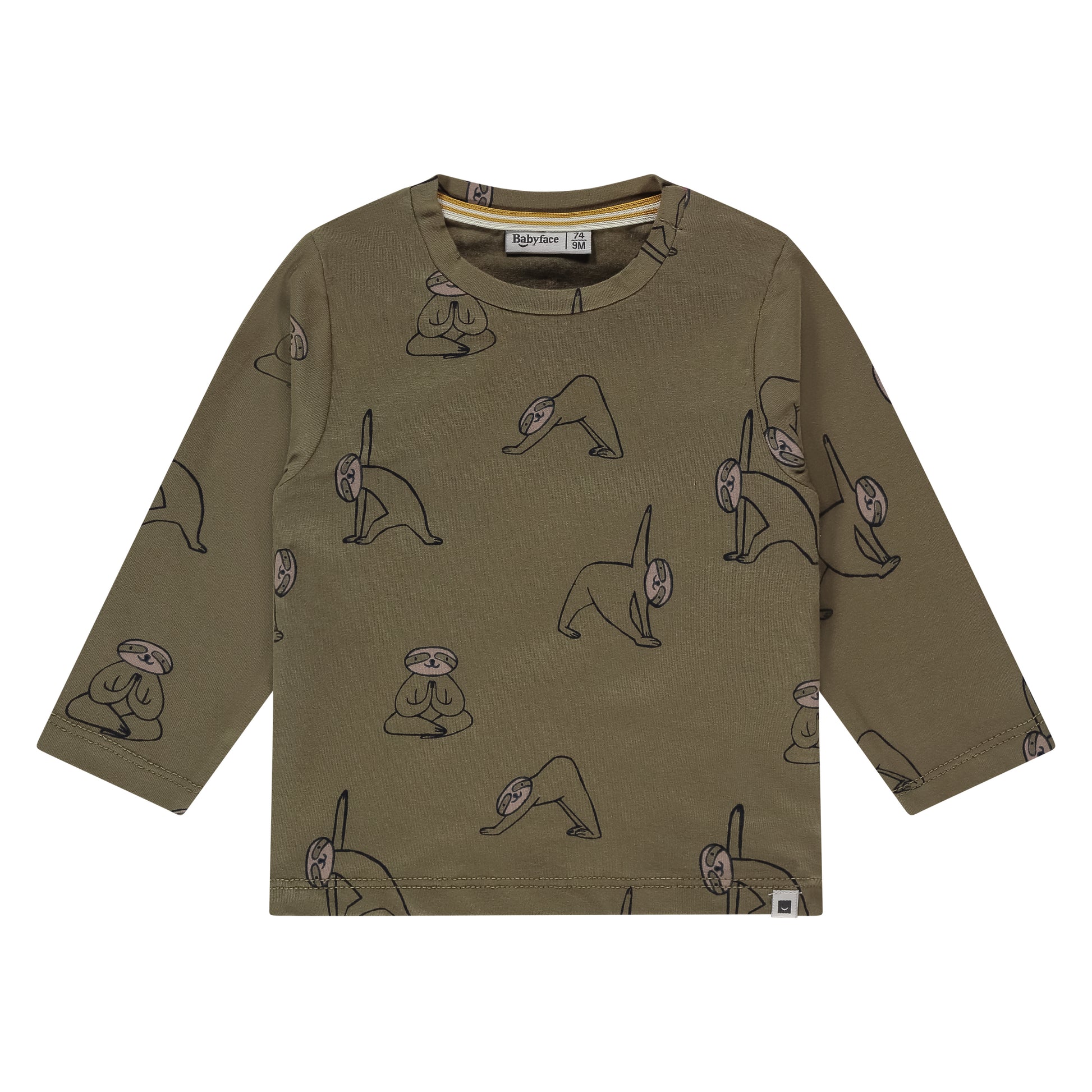 nothing is cuter than a sloth doing yoga! sloth printed long sleeve tee in the perfect army green. match back with our white & blue stripe denim overalls for an adorable outfit