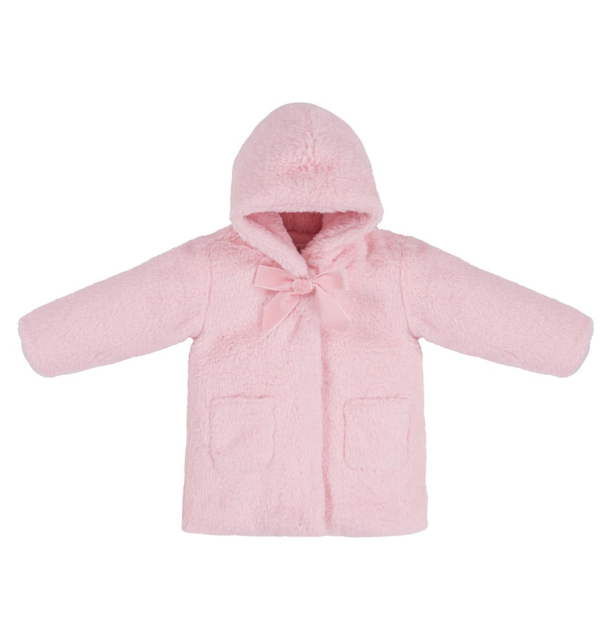 get cozy with this adorable pink hooded fur jacket. velvet bow at the front clasp for added girly detail plus front pockets!
