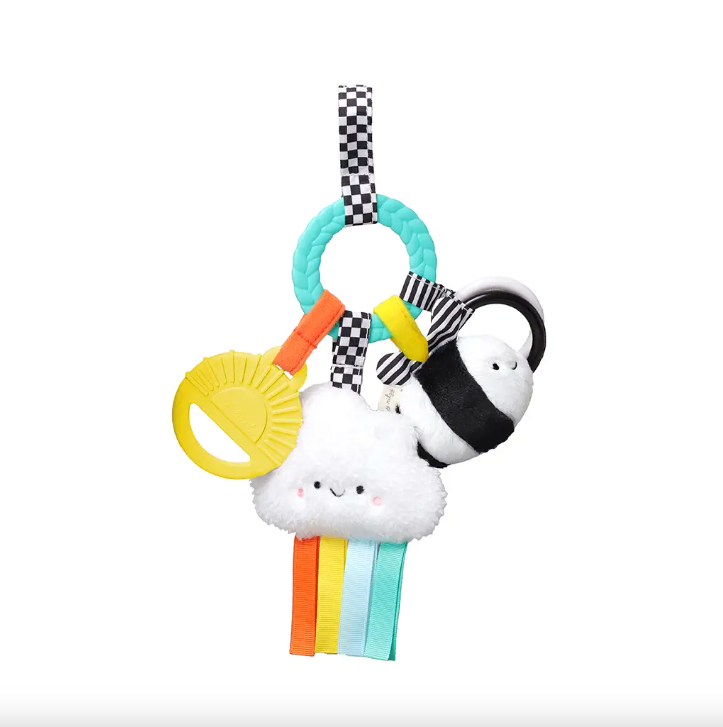 Teethe, Play & Explore! A sensory sensation, our Bitzy Busy Ring™ has all the love in the details with multiple features for baby to explore. Textured teethers and dangling toys that jingle, crinkle and delight – easily attach this toy to baby’s car seat or stroller for adventures ahead!