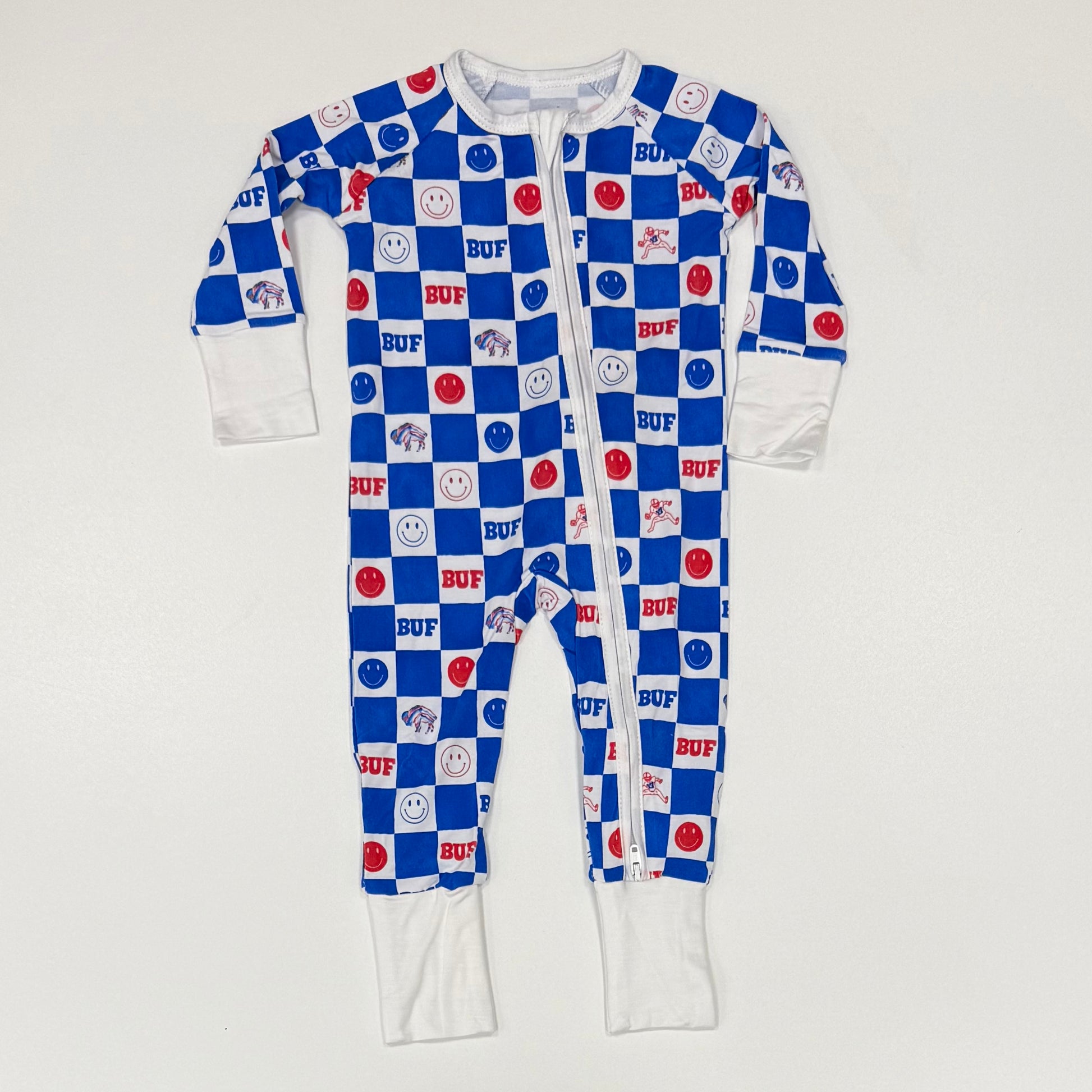 the buff check is a favorite for the cool buffalo bills fan! best blue & white check with fun graphics your little one will love! zip from foot to foot with convertible hands & feet