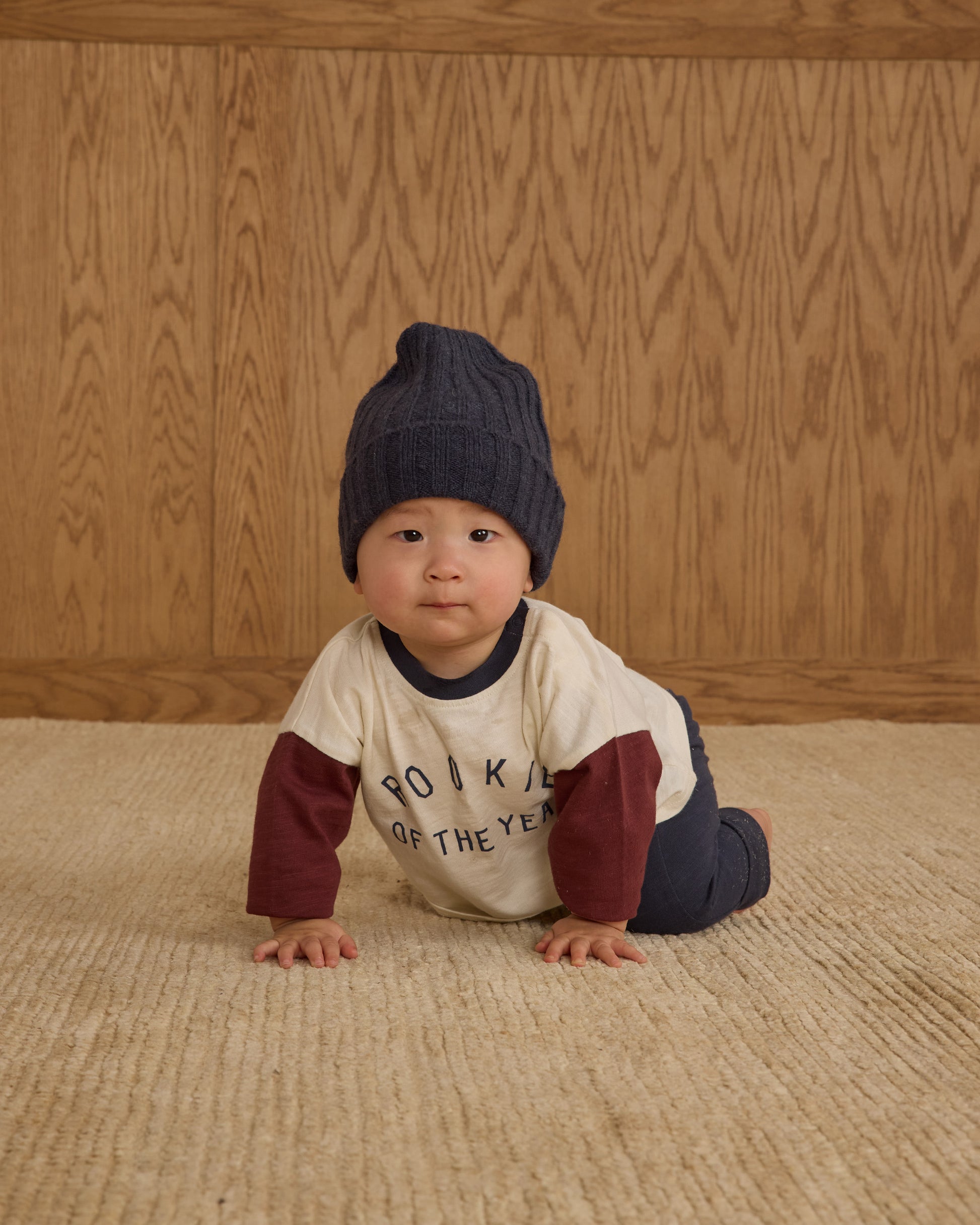 Our boxy-fit Camden Long Sleeve Tee is a seasonal staple, featuring contrast neck ribbing for a cool, classic look. Shoulder snaps included on sizes 3-6M - 18-24M for easy changes.