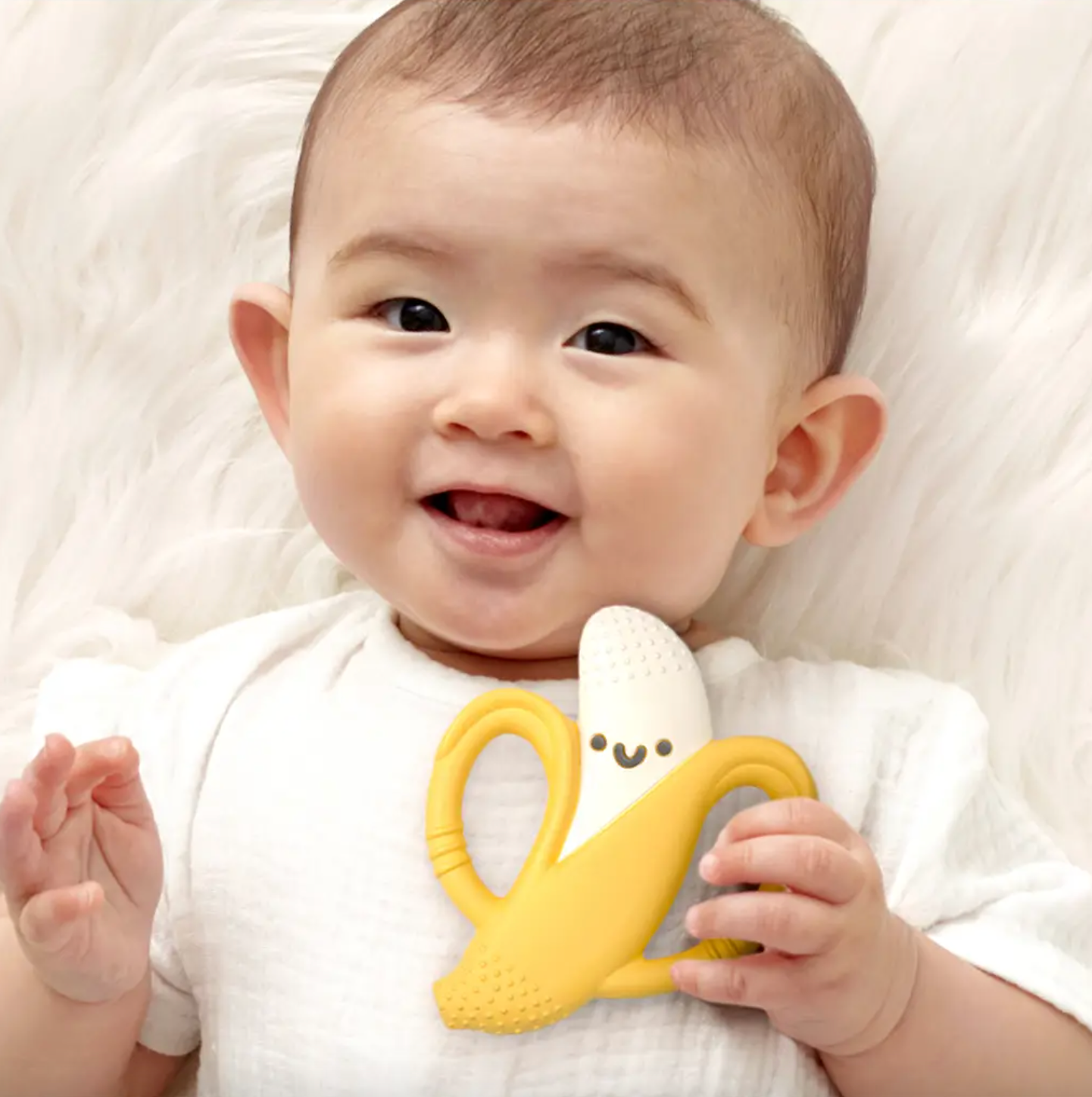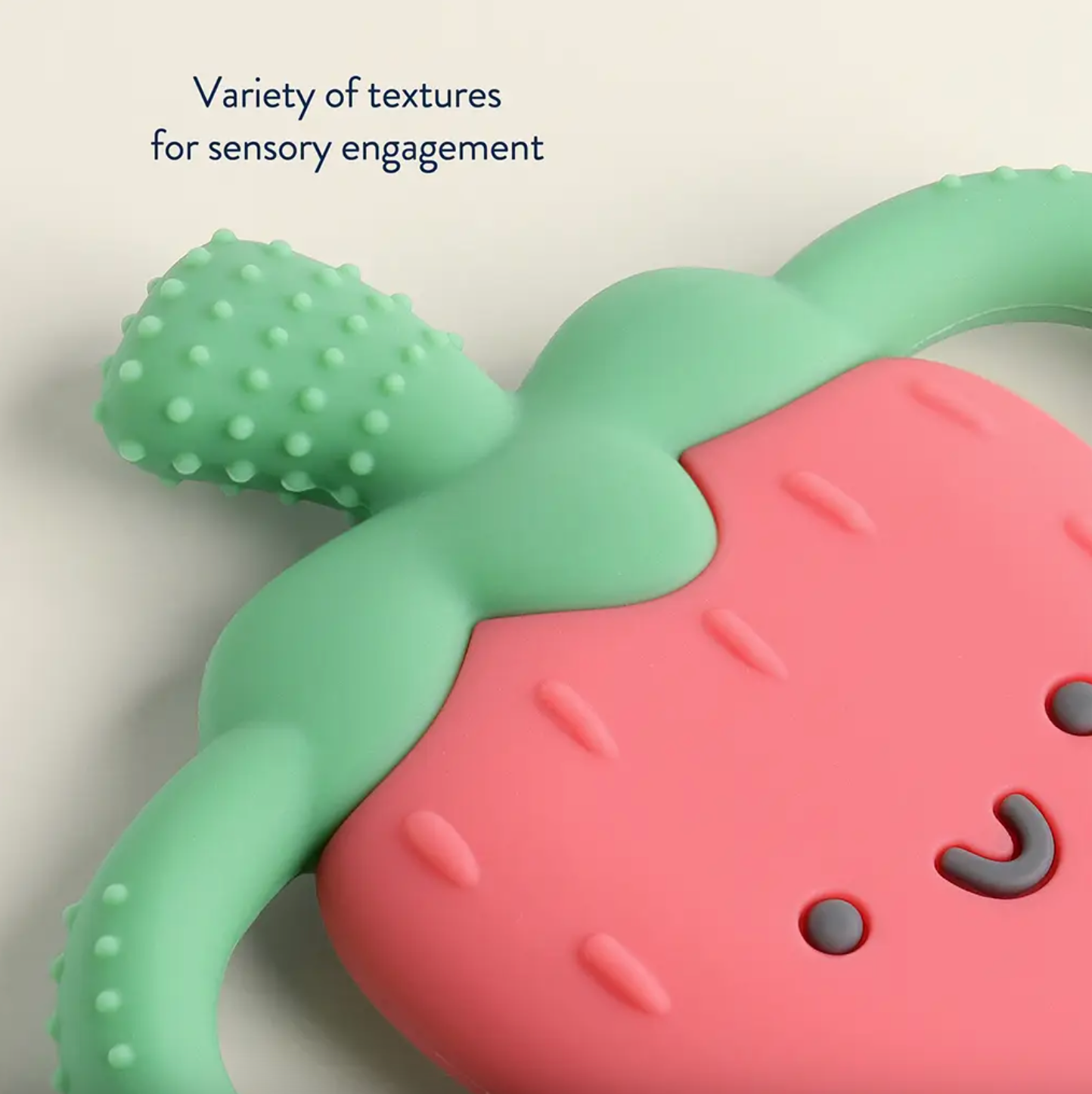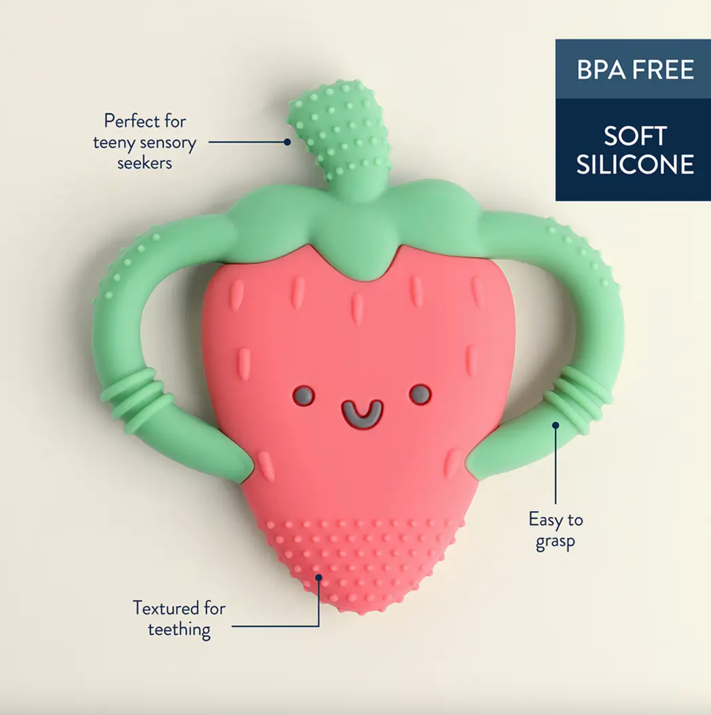Chew on This! Easy-hold silicone teether 3m+ textures soothe sore gums! Bid farewell to teething troubles with Itzy Ritzy’s Chew Crew™. Crafted with easy-to-hold handles, this teething companion offers soothing relief with a comfy grip for your baby`s teething journey.