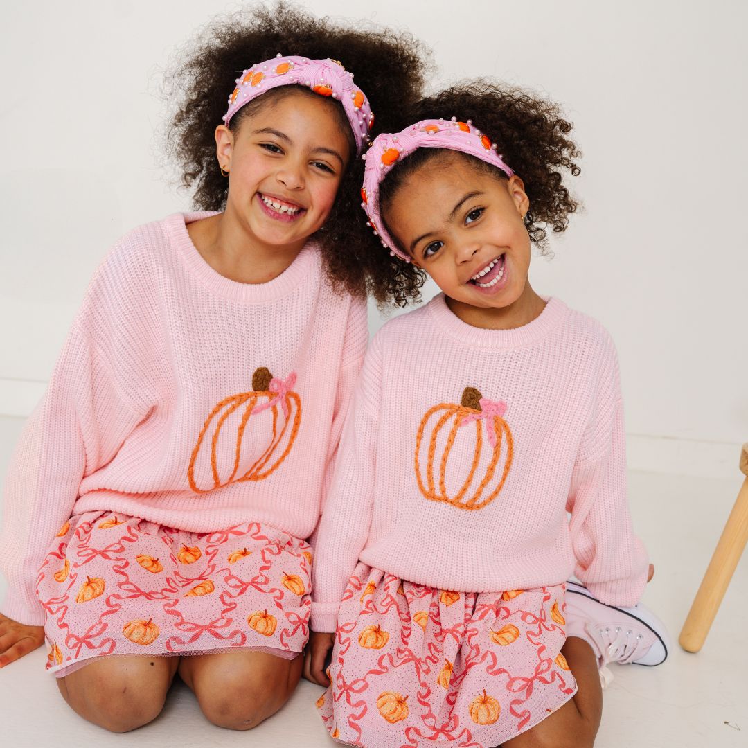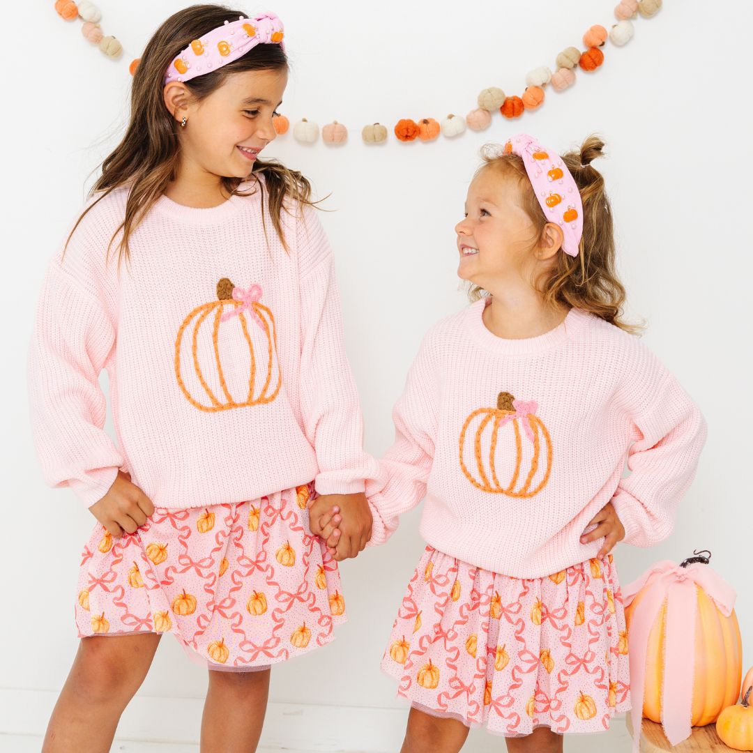 pink pumpkins for everyone! the perfect pink knit sweater with a pumpkin stitch for added cuteness!