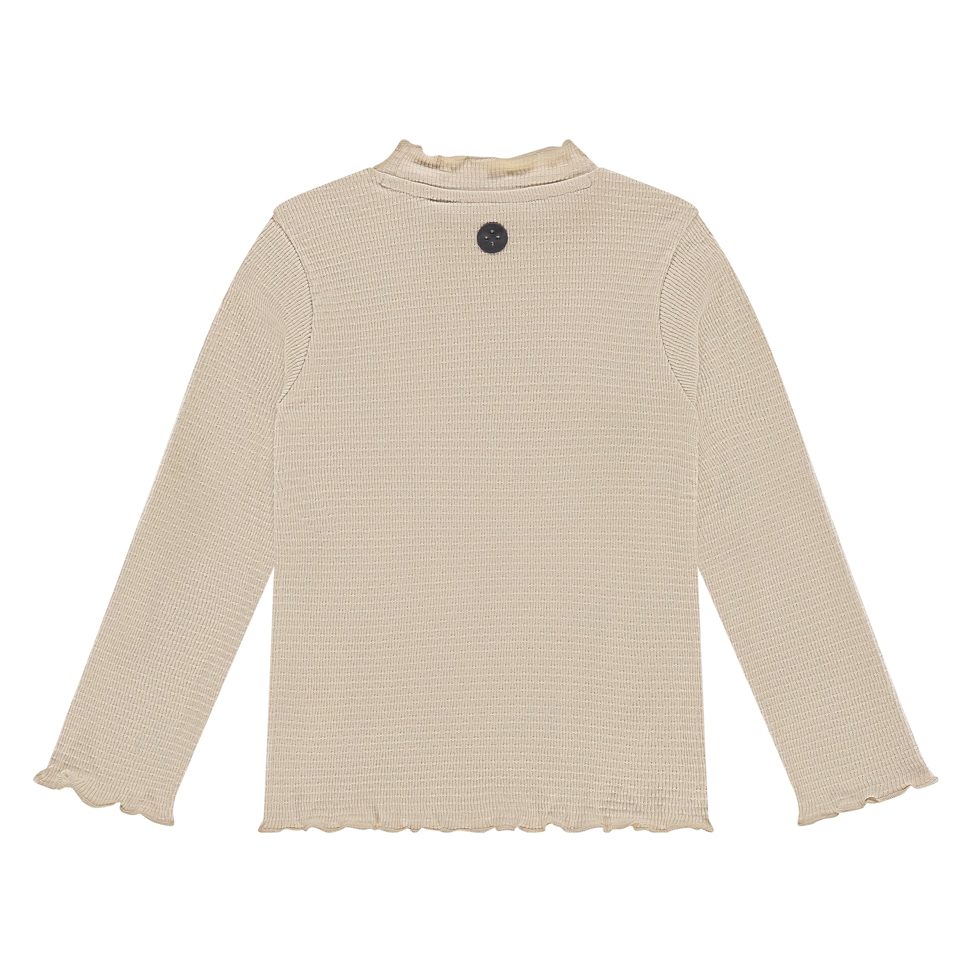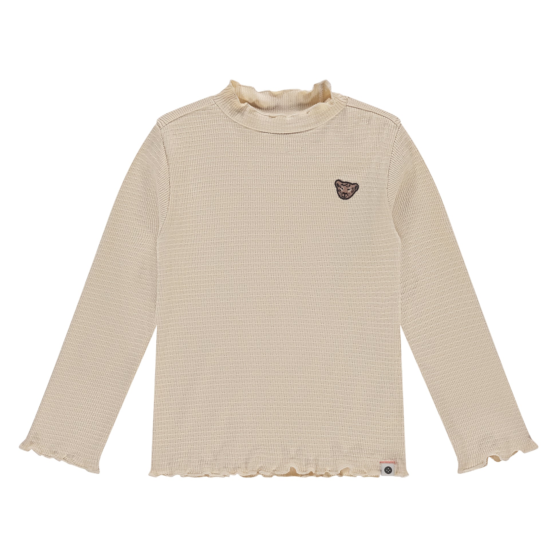 easy to wear long sleeve tee! cream textured long sleeve mock neck tee with ruffle edges & a leopard chest patch