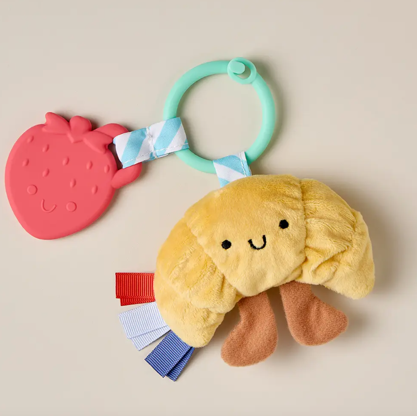 Chloe the Croissant! The Itzy Pal™ joins your little one as the most playful (& cutest!) pal on the block! Let baby discover the soft plush character, gentle silicone teether to soothe sore gums, engaging crinkle sounds and colorful textured ribbons.