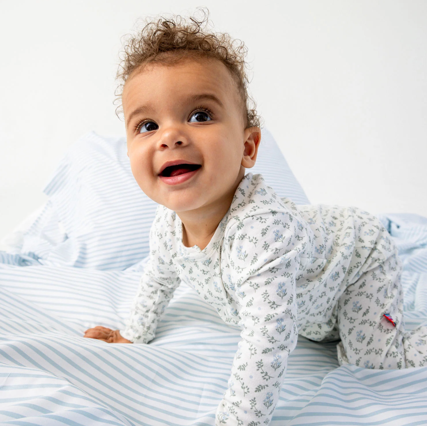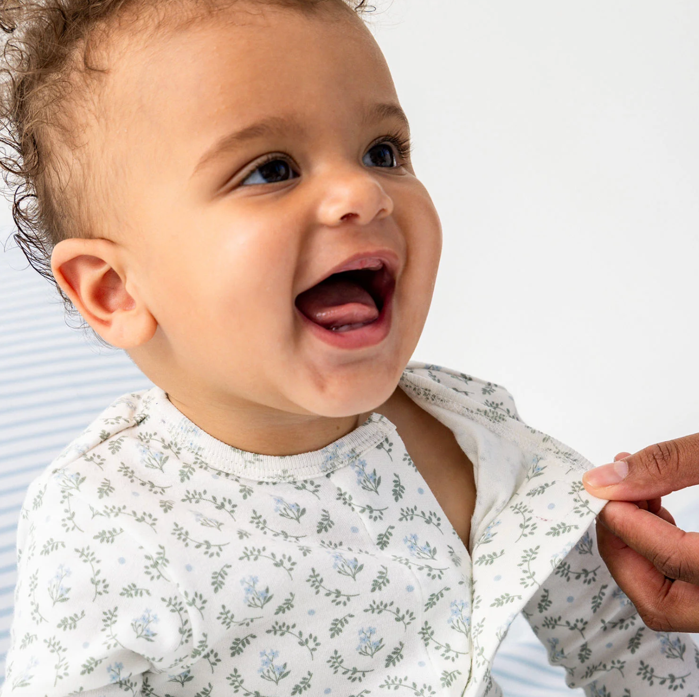 the softest floral for any new arrival! light blue & green dainty flower pattern on the softest organic cotton