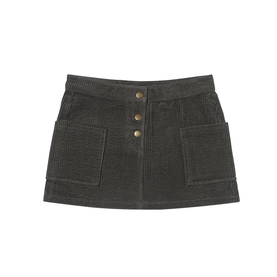 corduroy.. fall favorite! the perfect grey cordurory mini skirt with front pockets & snaps front. elastic at the back for easy wear