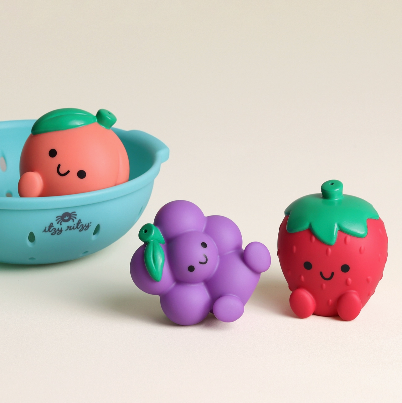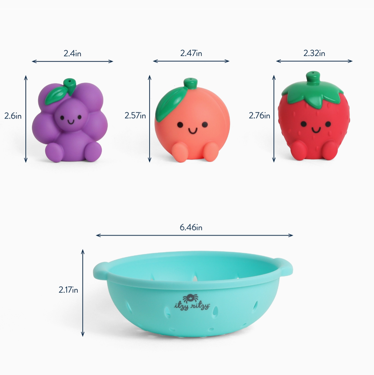 Squeeze in some fun! With Itzy Splash Pals™ bathtime play is overflowing with possibilities! These squeezable fruit-shaped squirties and sprinkle strainer encourage motor skill development and are great for creating endless bath time adventures!