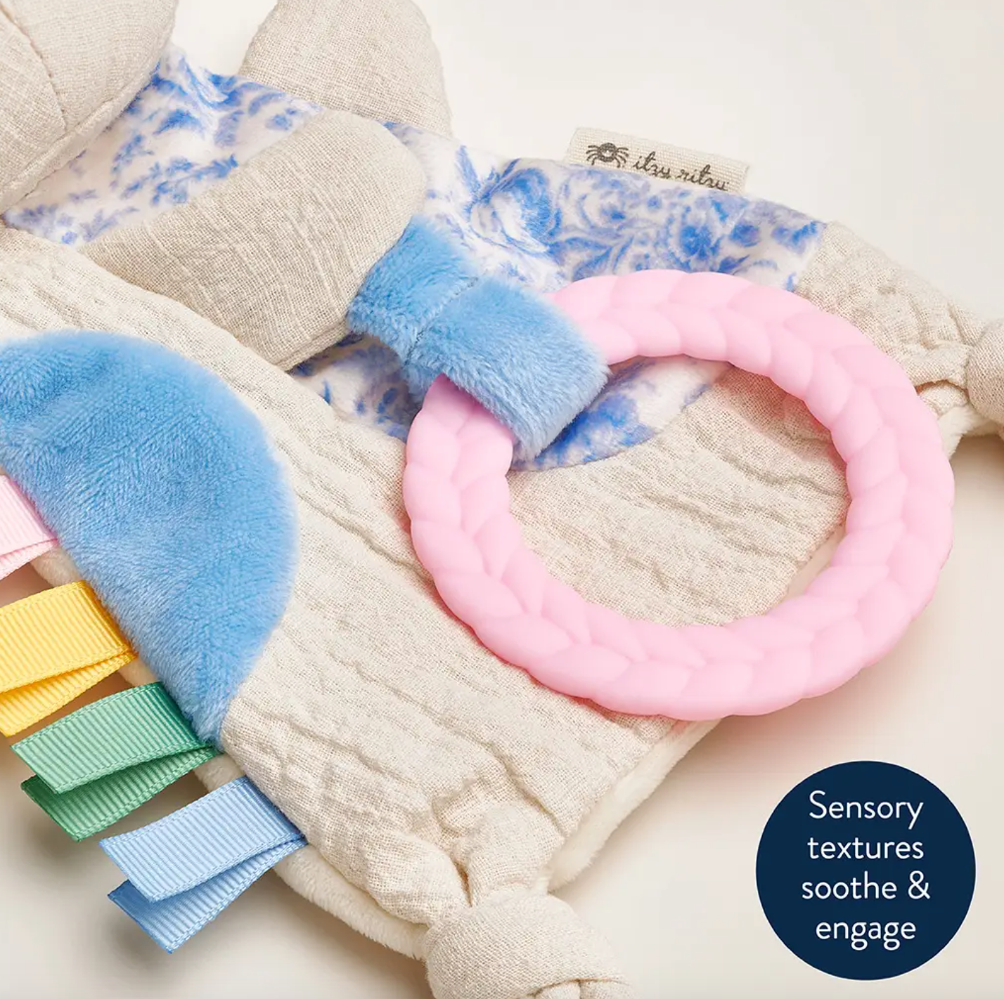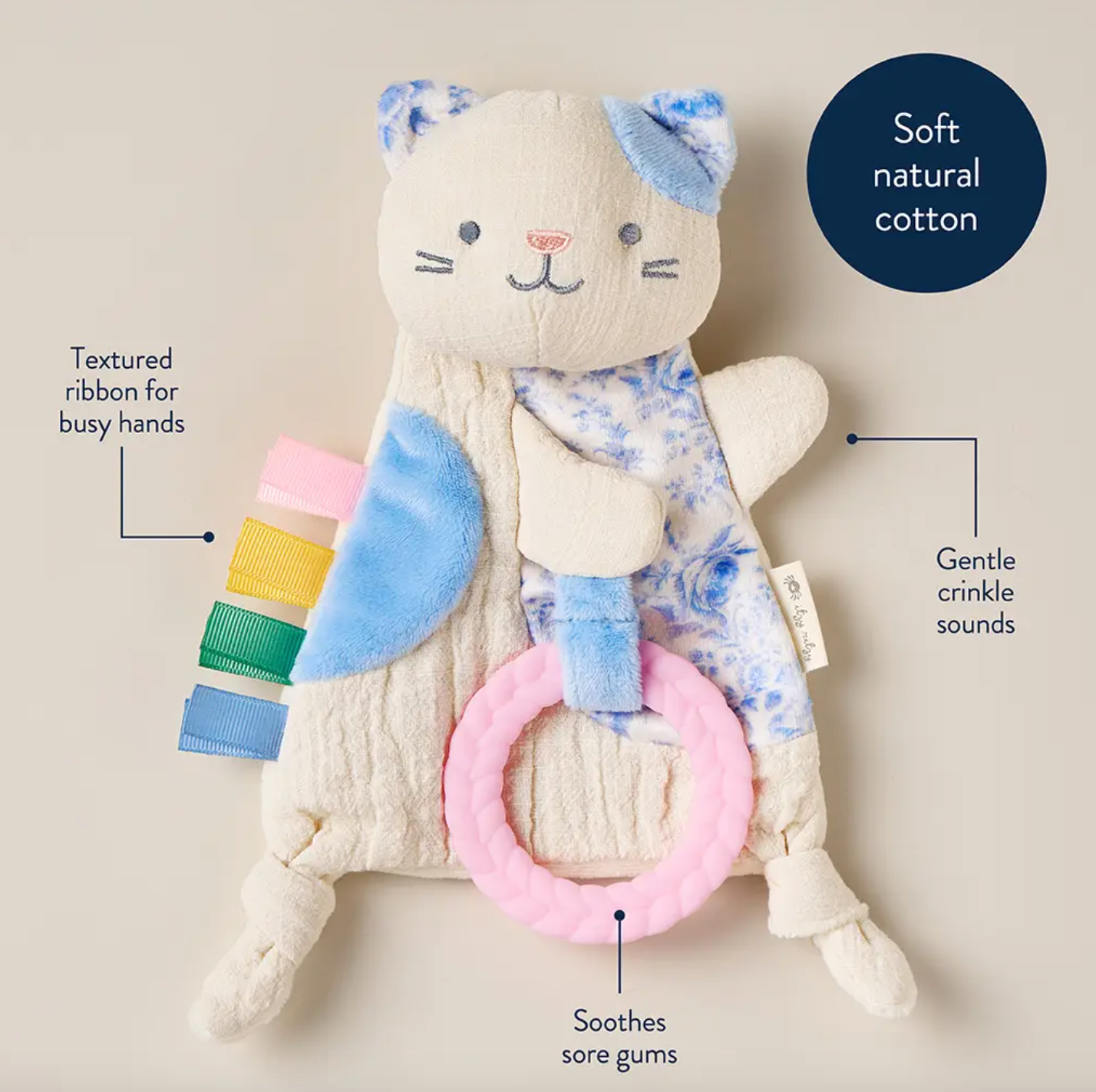 Meet Bitzy Crinkle™, a loveable sensory toy that crinkles and excites. With features like soft natural cotton fabric, textured ribbons and a braided teether, baby will love to explore this new friend. Watch as your little one is captivated by crinkles and giggles! This adorable sensory toy will be your baby`s new BFF! Our Bitzy Crinkle is a soft, natural cotton crinkle toy that includes textured ribbons & a teething ring.