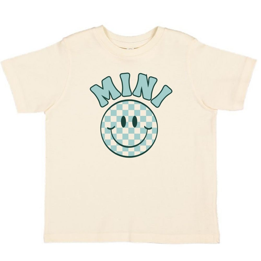its the cool little one that is only the perfect 'mini' of mama! adorable bright blue checkered smiley tee on a natural color