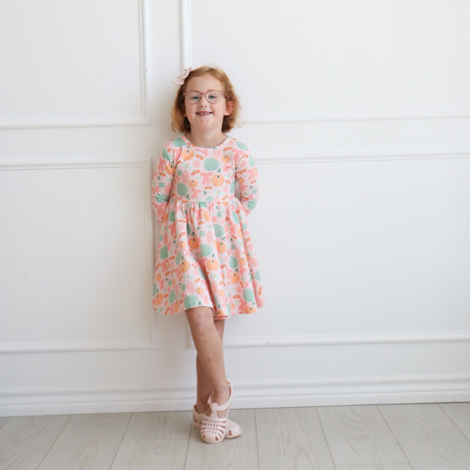 With this adorable, whimsical allover print of pastel pumpkins, moth butterflies, and bows, plus long sleeves for cooler days –- your girl will be reaching for this all fall long!
