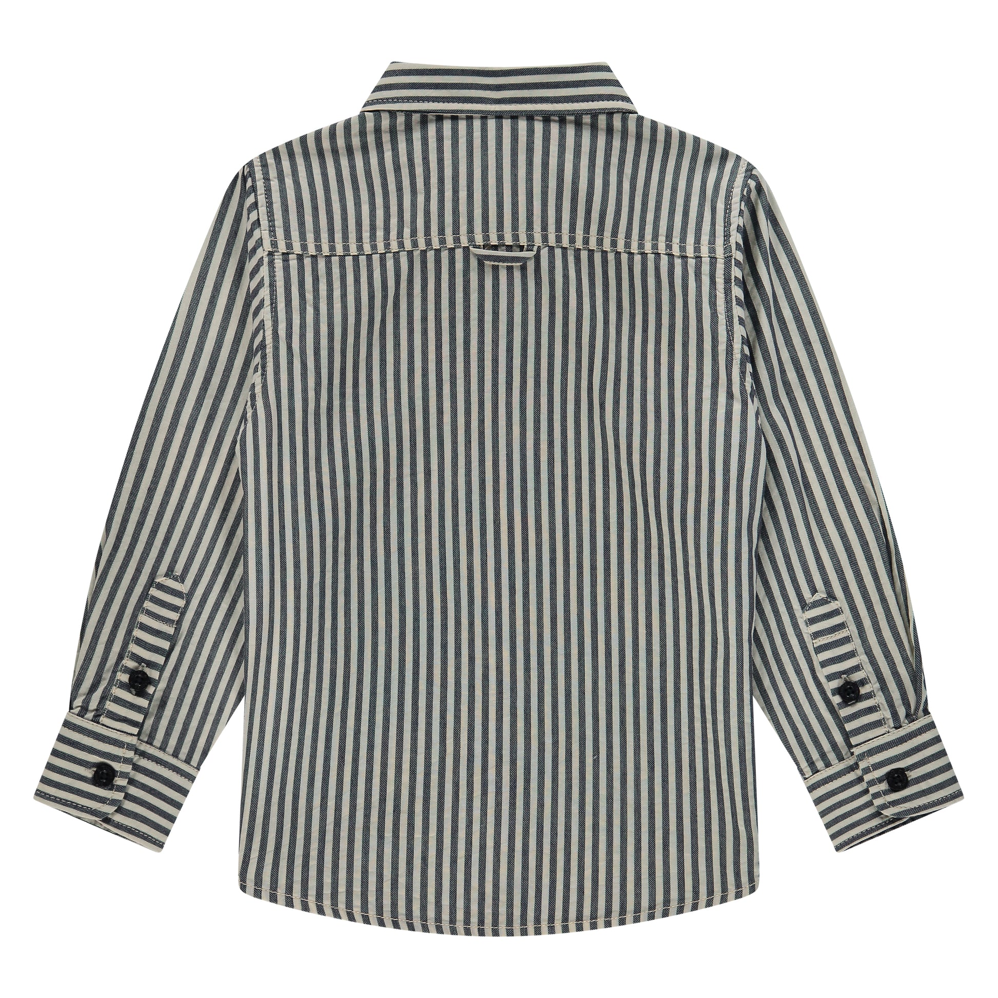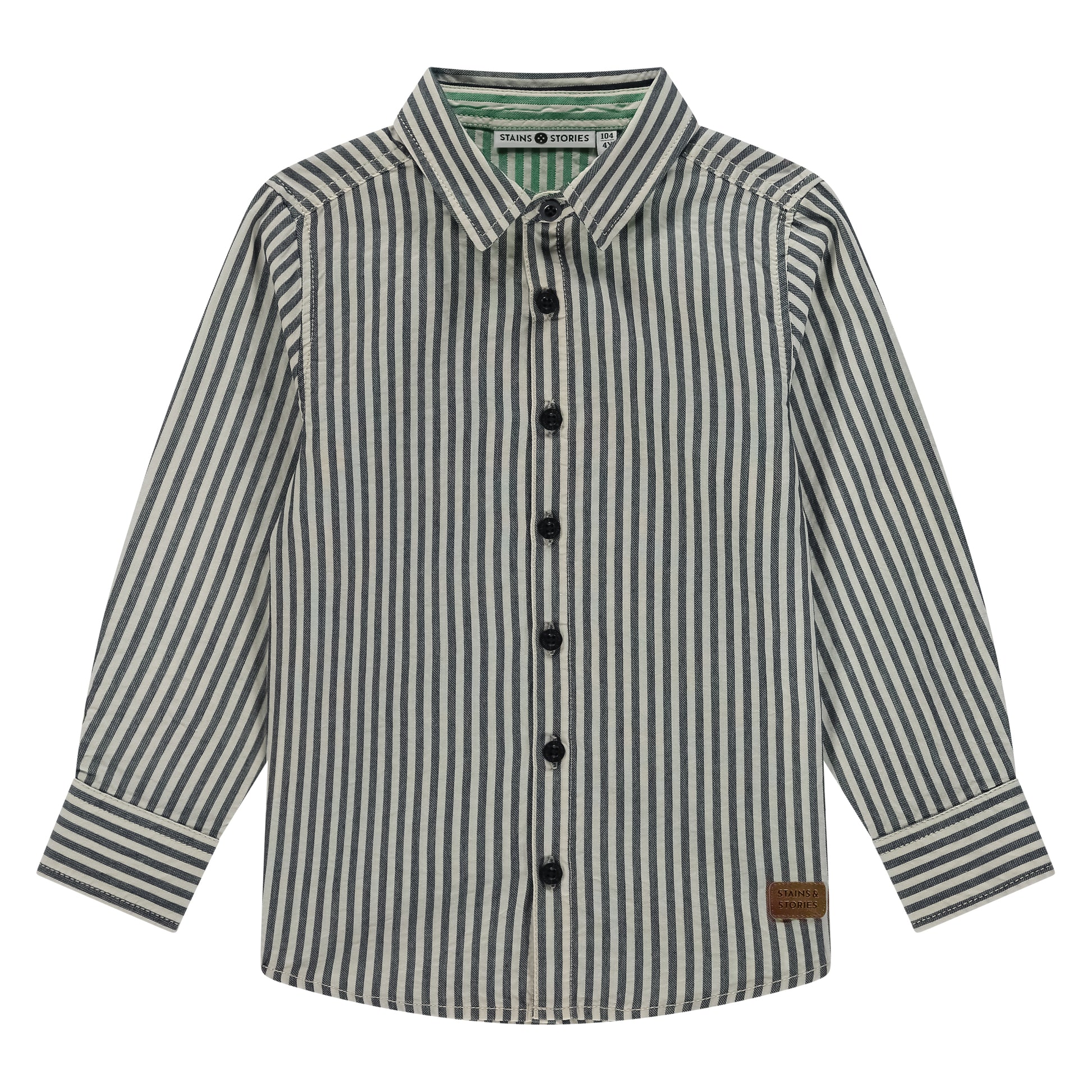 a classic button down shirt in a blue & white stripe with pops of a green & white stripe. an easy essential for everyday wear for dress up or casual