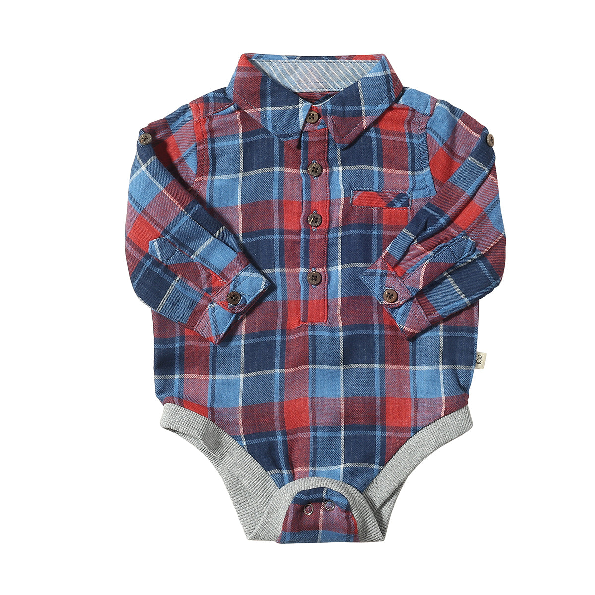 your favorite shirt onesie in an amazing blue & red plaid. dress up with a red sweater for the perfect holiday family photos! button front with snaps between the legs with jersey rib trim for easy wear & changing