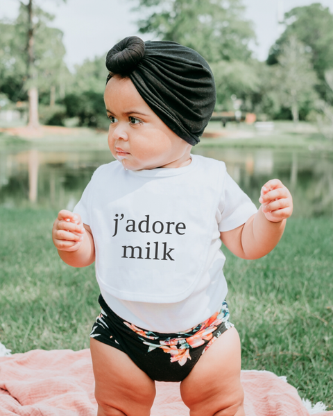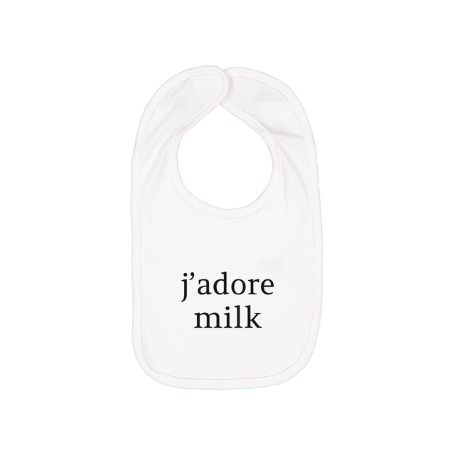 j'adore milk, your babies new favorite bib! velcro closure for easy on & off