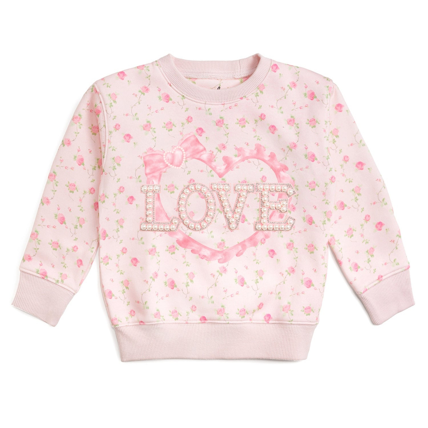 its the season of love! light pink floral printed sweatshirt with a rhinestone & pearl 'love' patch