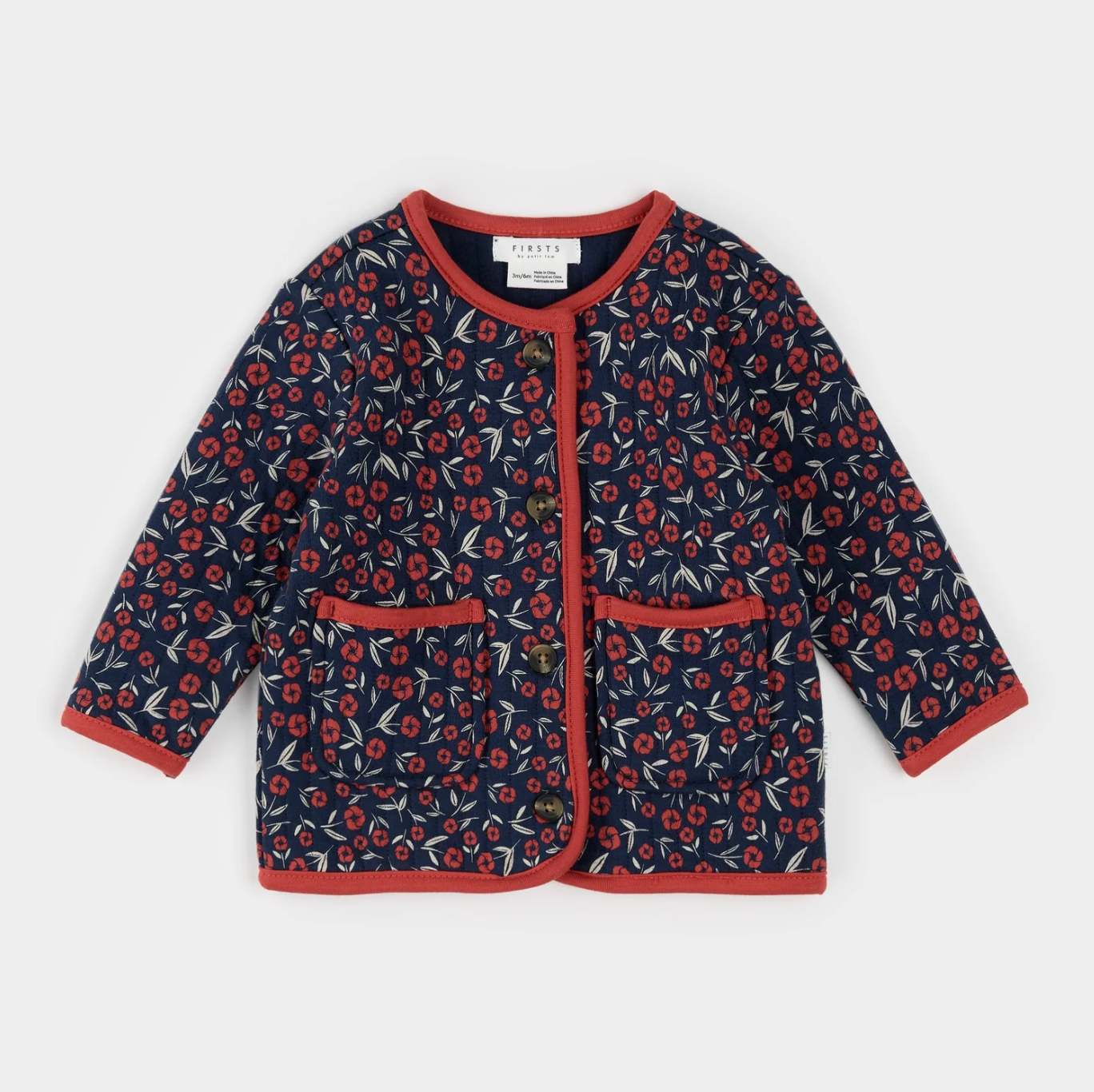 all about the poppys this season! adorable navy & poppy red printed quilted jacket that is perfect as a 2nd layer or a light weight jacket. front pockets & super soft fabric