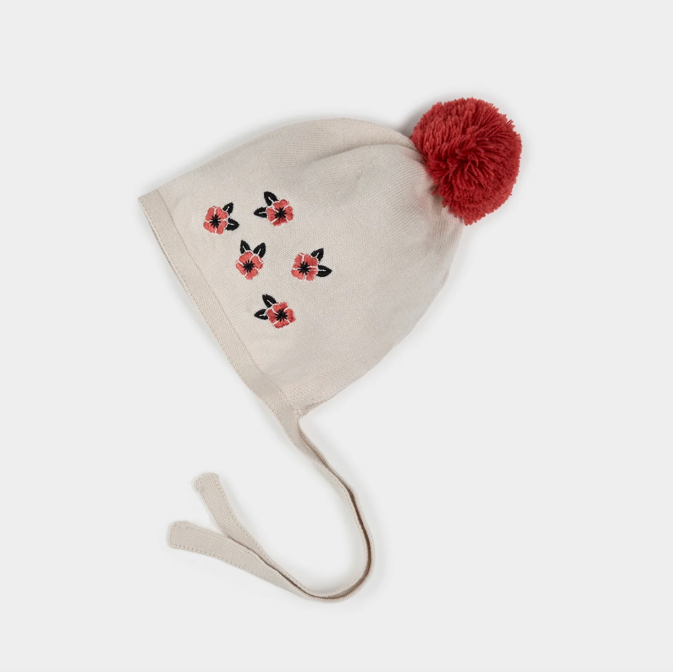 nothing cuter than a pom pom hat to add to an outfit! beige knit sweater bonnet with pink poppy floral embroidery!