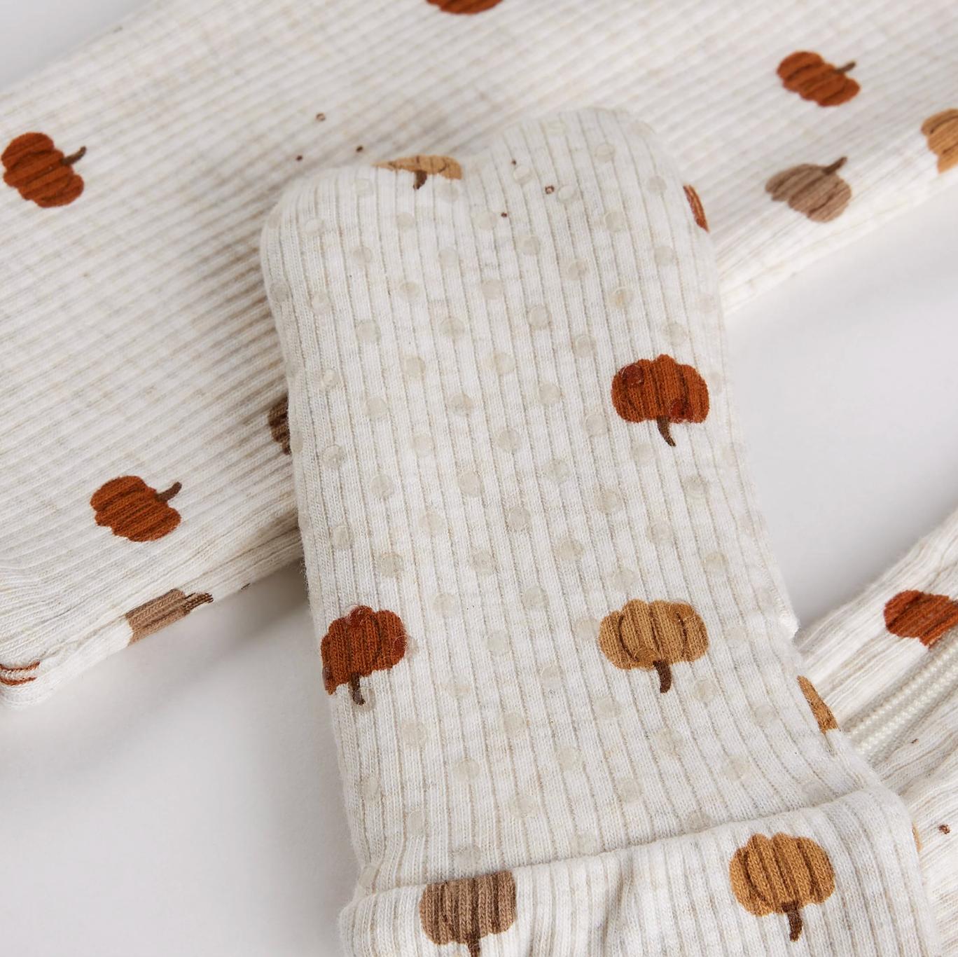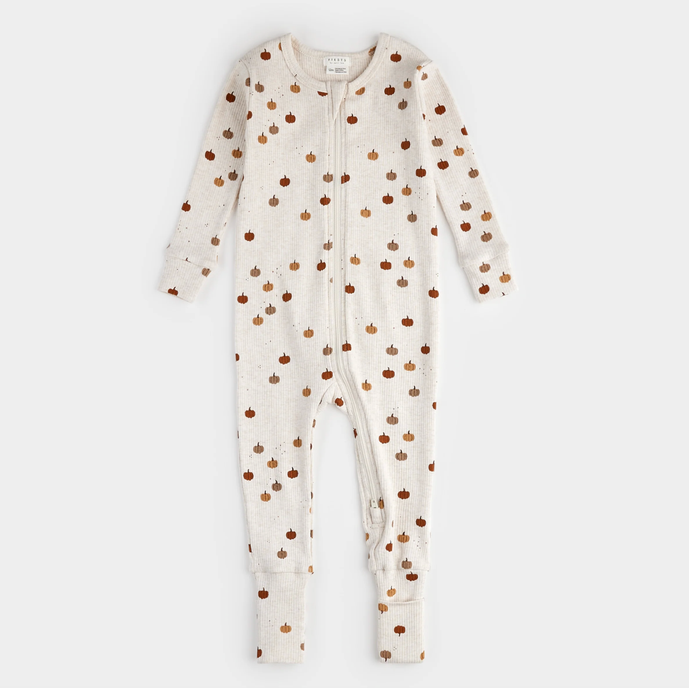 its pumpkin season & this super soft stretchy rib convertible footie is a must have! light oatmeal color with multi color pumpkins - don't forget the convertible feet!