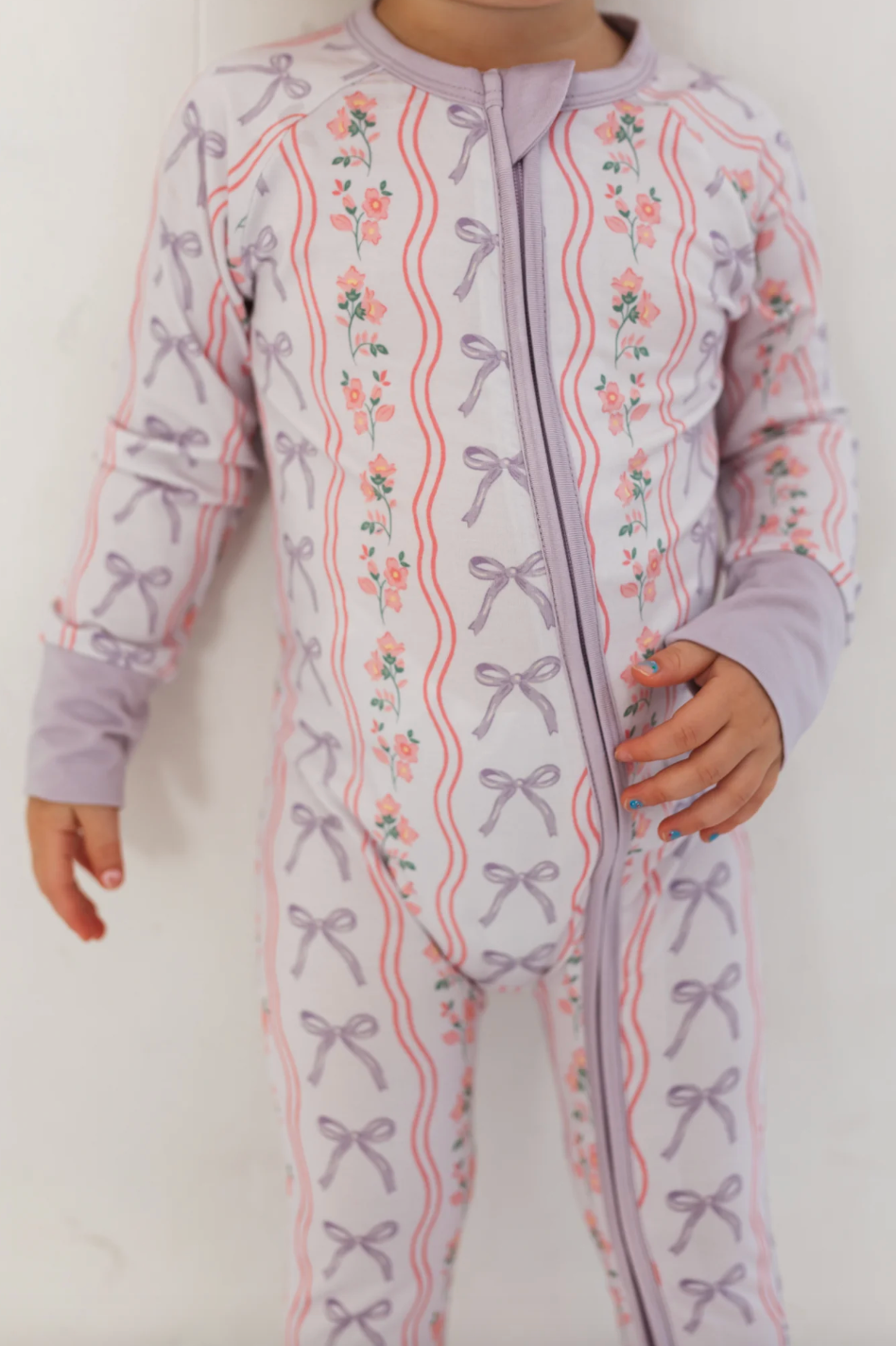 pretty in purple! adorable purple & floral printed zipper romper that is perfect for every new little arrival