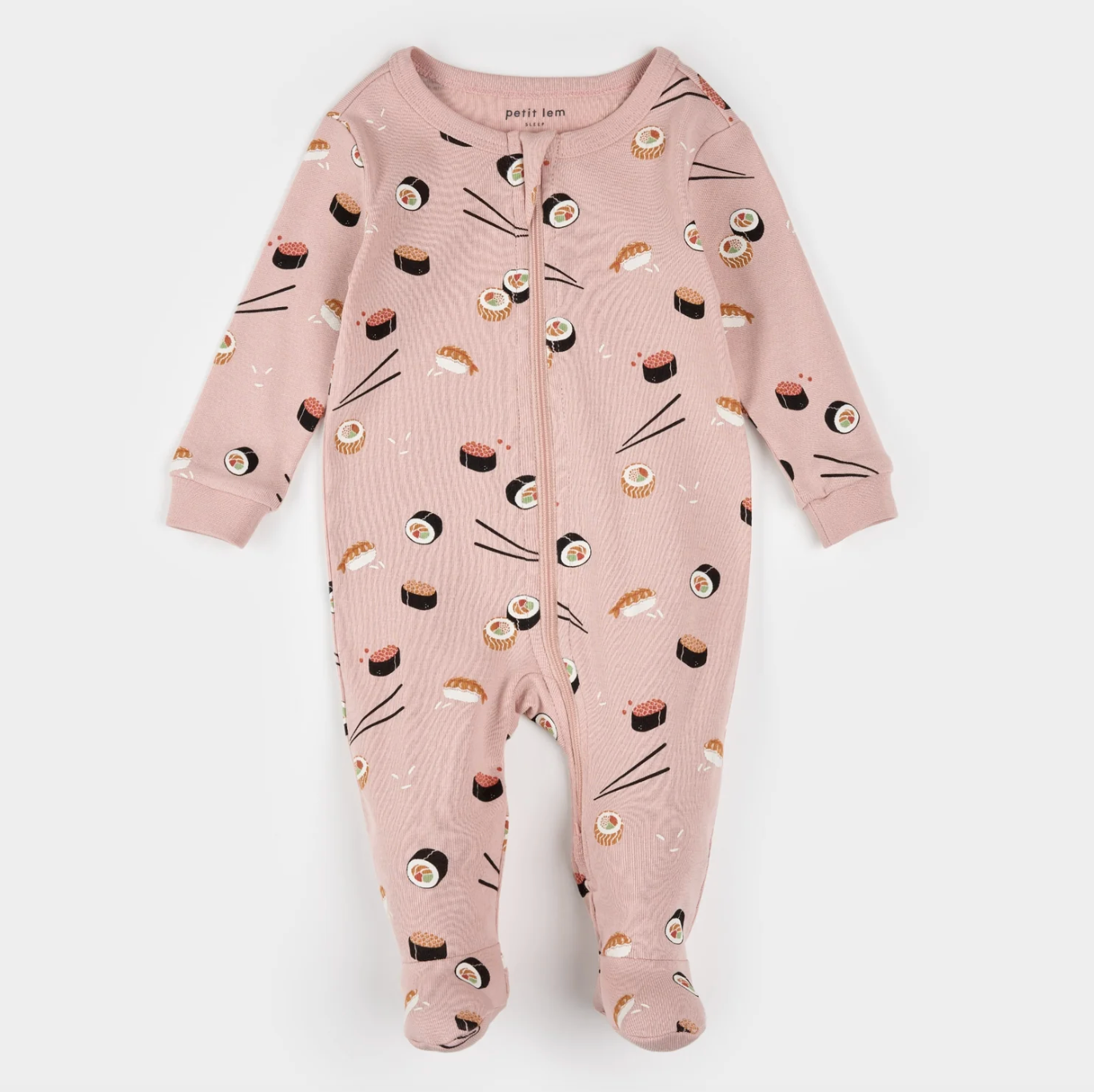 pink sushi pjs - yes pls! adorable pink footed pjs with the cutest sushi print. softest cotton with a two zipper they are an ideal for a new baby