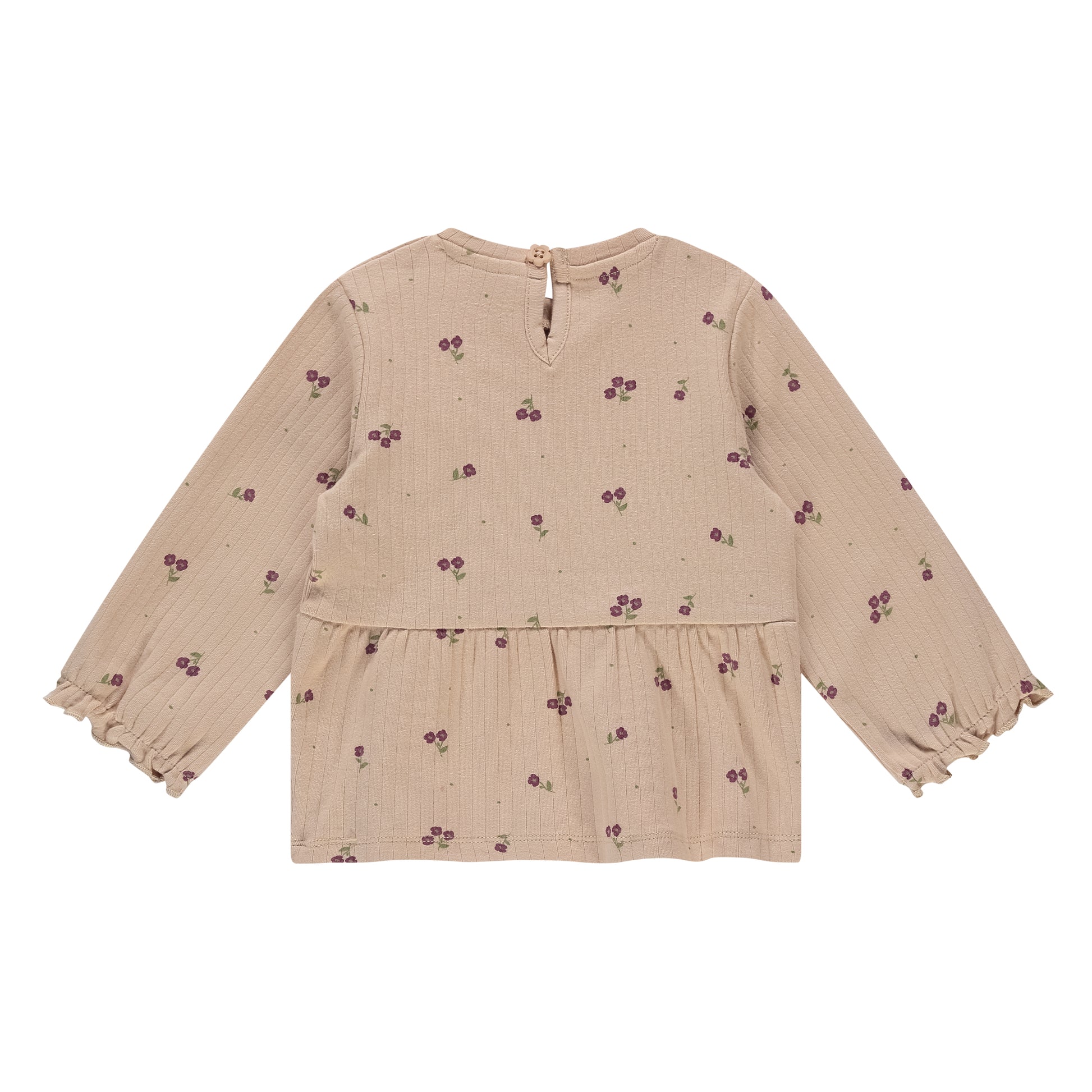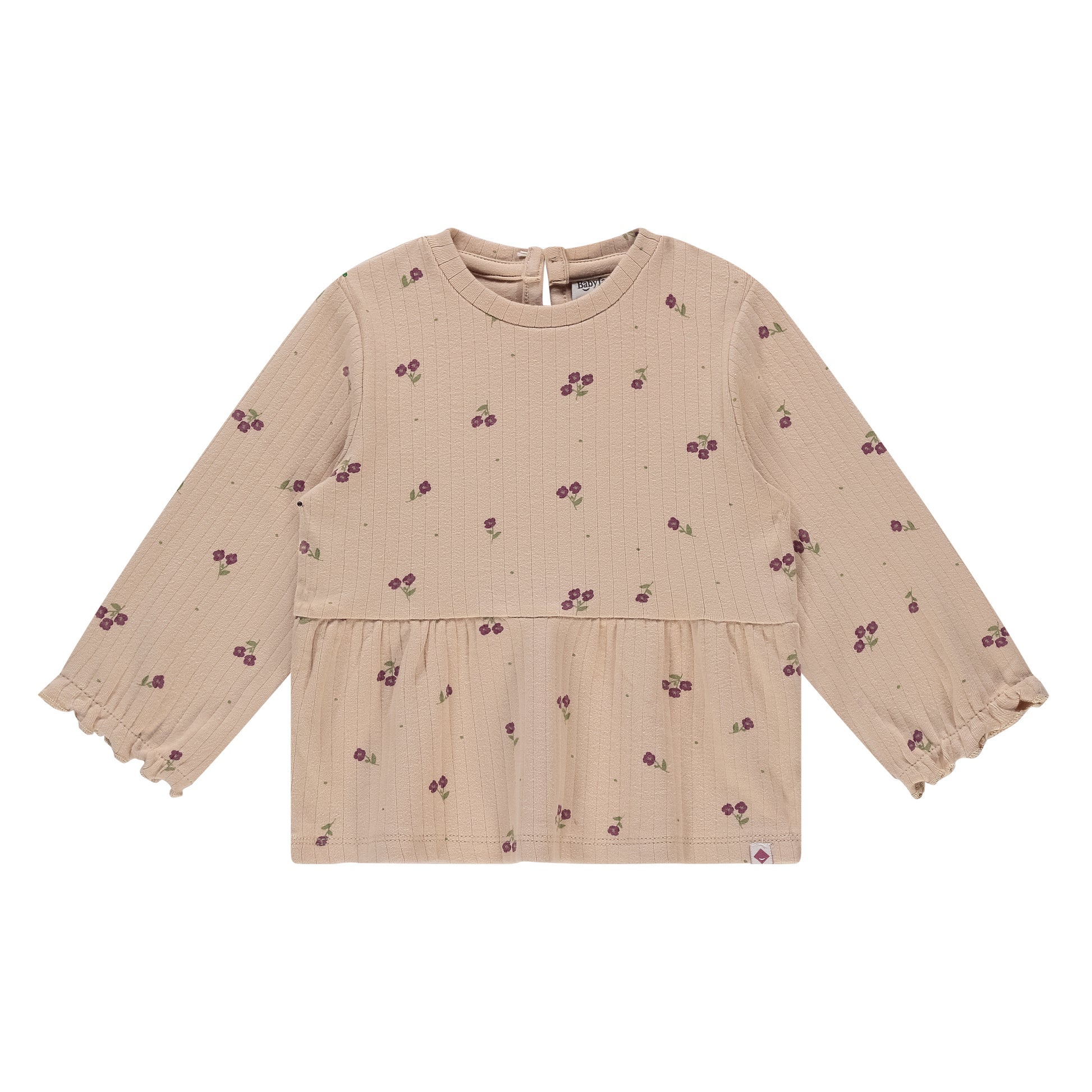 fall is for florals! adorable nude & purple floral shirt with ruffle details at the sleeve & waist - a great option for a new arrival