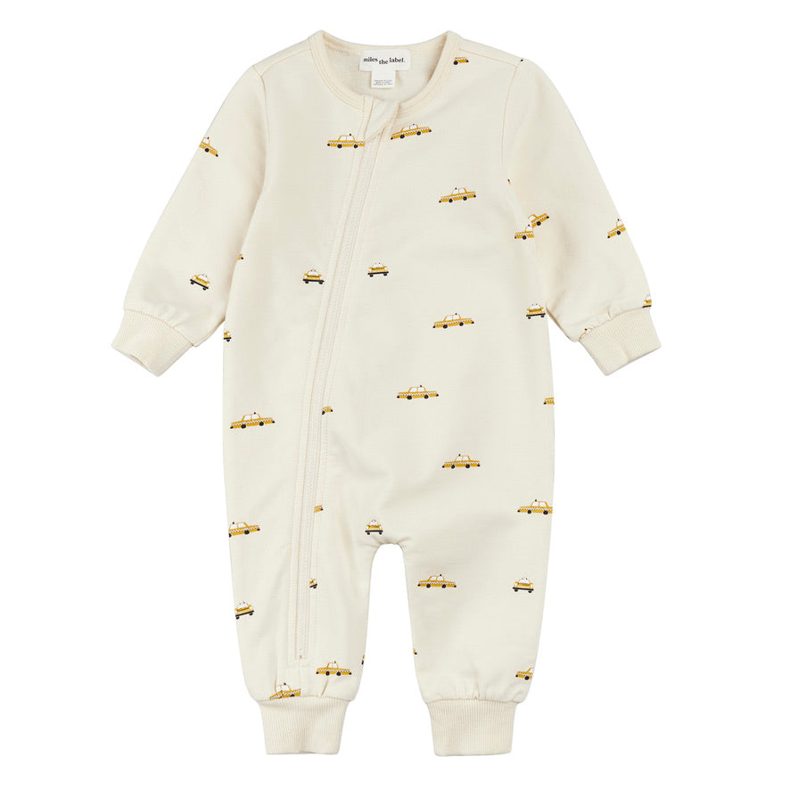 bright yellow taxi cabs are always a love! adorable cream colored terry sweatshirt romper with a fun taxi graphic - full zip from top to foot