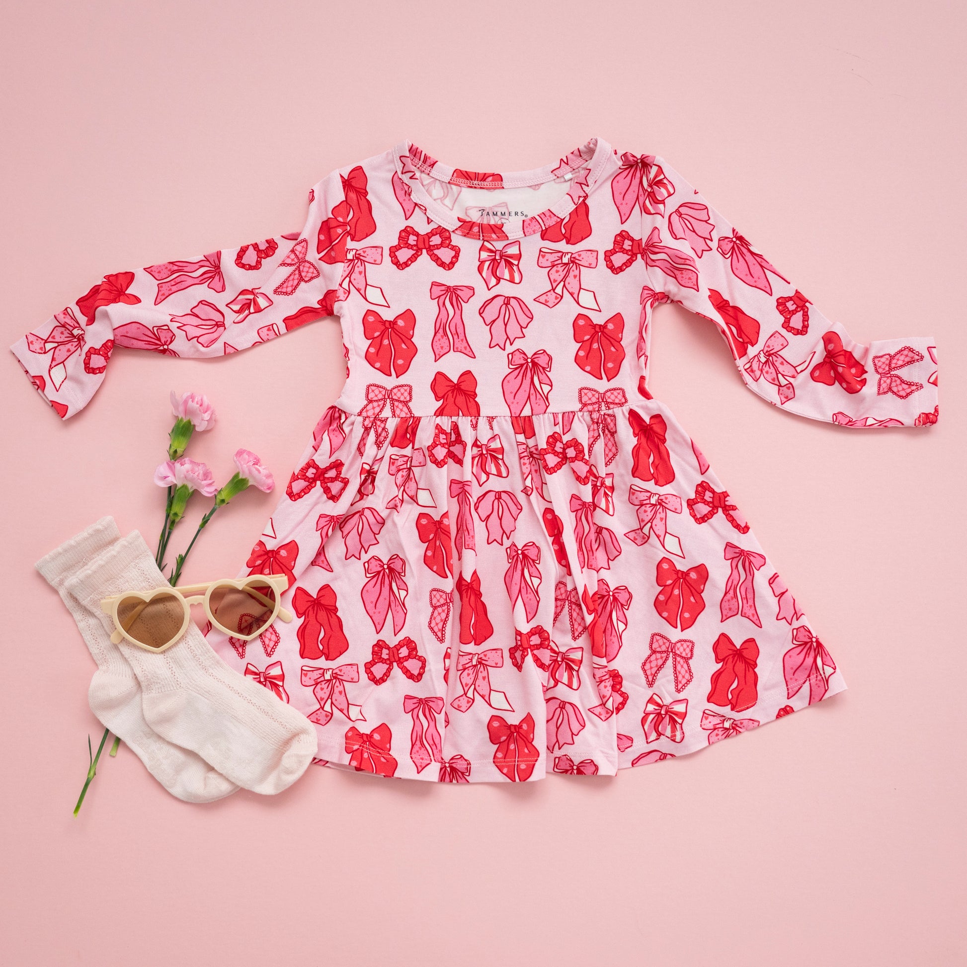 bows & Valentine's Day! adorable pink & red bow print in your favorite twirl dress! super soft & a full skirt it will absolutely be a love!