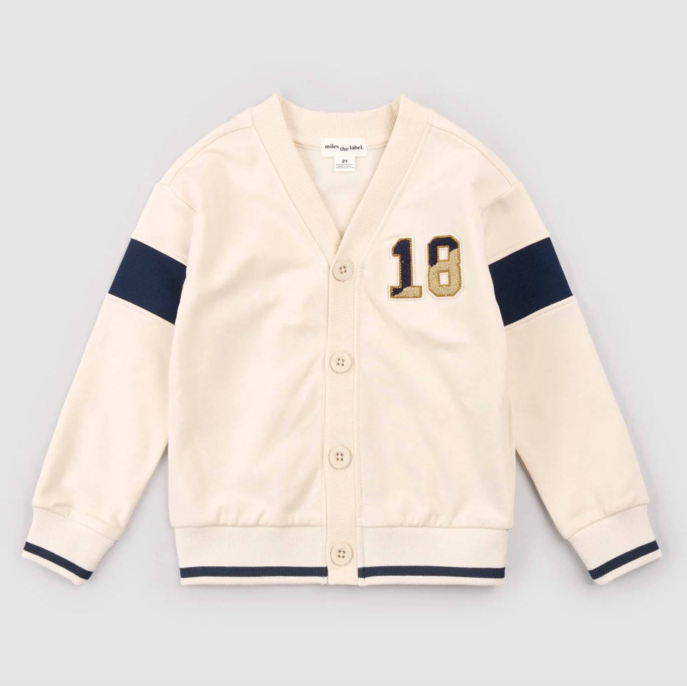 its back to school season! adorable sweatshirt cardigan that is collegiate inspired - pops of gold & navy for added details. great way to dress up a cozy sweatshirt