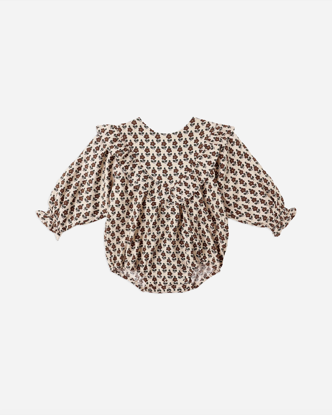 Our Winnie Romper features darling V ruffle trim, elasticized sleeve and leg openings for a sweet bubble silhouette, and bottom snaps for easy changes.