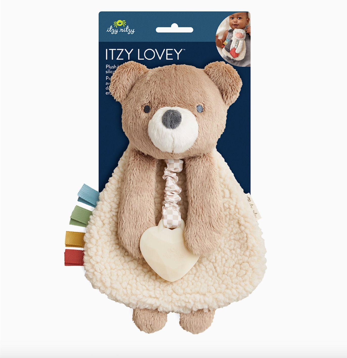 softest sherpa with textured ribbons, silicon teether, & crinkle arms its sure to calm your baby down and entertained!